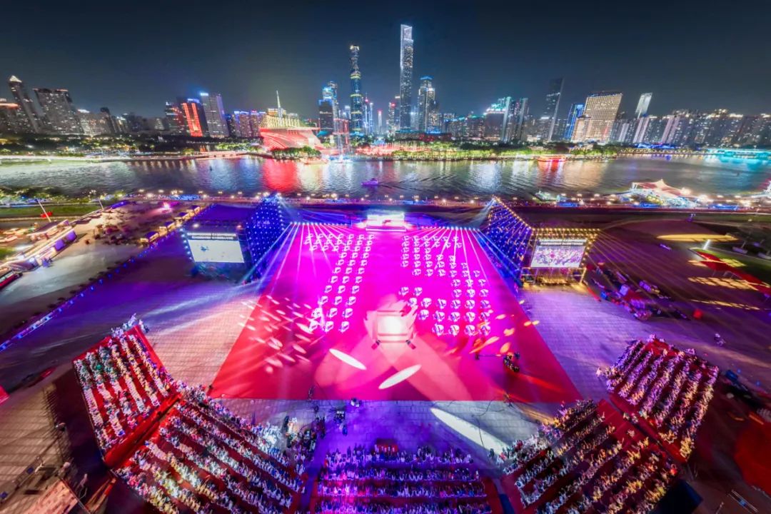 百琴合奏《我爱你中国》《我的中国心》《海阔天空》等歌曲,与广州塔、珠江沿岸等璀璨夜景交相辉映,各界群众代表群情激昂、挥舞国旗,汇成一片红色的海洋,形成了一场“天空+地面”星光共绚烂的视觉盛宴,场面震撼人心。